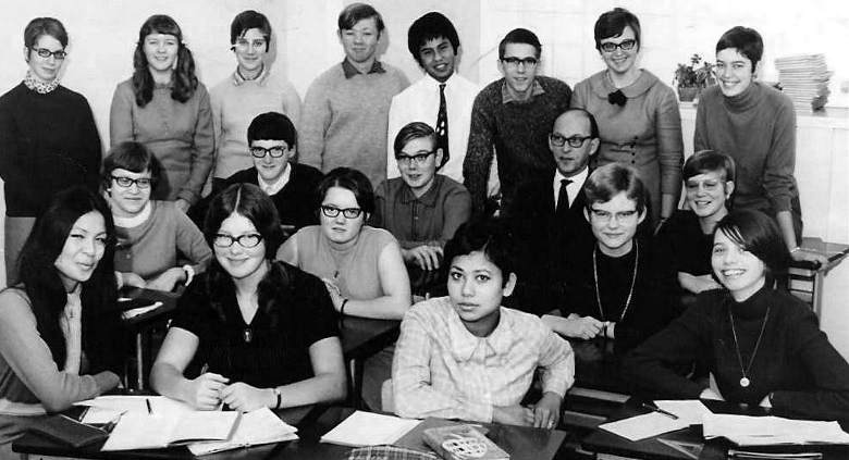 Staand vlnr: Hetty de Ridder*, Dineke Taal*, Ria Vermeulen*, Bert Brochard*, Leo Anzemberger*, Robbert van de Sande*, Coby Kuiper* en Emma Brink*. Achterste rij vlnr: Jack Moens*, Jochem Janson*, dhr. H.J. Vermeij (overleden) en Hanny Beekhuizen*. Middelste rij vlnr: Rita Tinga*, Fenje (Fenny) Drop* en Ans Hermsen*. Voorste rij vlnr: Léonne Smith*, Mary Zuidam*, Irene van der Poel* en Gerda Zakee*. Niet op deze foto maar wel in de klas: Rita van der Heijde* *) adres bekend of leerling staat op SchoolBank.nl. Alle leerlingen van deze klas zijn gevonden!!!!! 13-10-2004 |