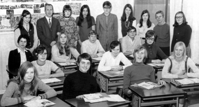 Staand vlnr: Anita Beekink*, dhr. P. Bleijenberg (overleden), Winnie Bos*, Wanda Streur*, Kees Bregman*, Cora de Graaf (overleden), Geertje de Groot*, Peter Spronk* en Ria de Nas*. Zittend achterste rij vlnr: Paul Samethini*, Linda Burggraaff, Kees den Hollander* en Paul van de Kraan*. Middelste rij vlnr: Liesbeth Bolijn*, Ottoline Rudolph* en Sjany Roest*. Voorste rij vlnr : Beatrix van de Heuvel*, Wim Venema*, Frank Lentz* en Martie Verstrate*. *) adres bekend of leerling staat op SchoolBank.nl. 13-10-2004 |