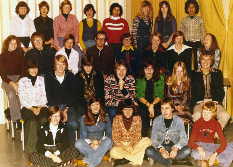 Achterste rij vlnr: Anja van Veelen*, Manna Bargpeter*, Mariska Schram*, Mieke Heijmans*, Helen Tjin a Lim, Marion van de Vlist*, Jolanda Dekker* en Stuart Visser (nu Limon)*. Tweede rij van achteren vlnr: Inèz Westerduin*, Michel Breukink*, Theo Vrolijk*, dhr. J.F. Dijkstra*, Rene Lorsheijd*, Anneke de Bruin*, Astrid van Bergen* en Angela Caro. Tweede rij van voren vlnr: Conny van den Heuvel*, Martin Dotinga*, Paul Bout*, Peter Gossen*, Marja Heij, Ellen Peeman* en Hans van den Berg*. Voorste rij vlnr: Anja Koene*, Petra Brouwer, Lidy den Dulk, Jan Vegter (overleden) en Ruud Johler*. *) adres bekend of leerling staat op SchoolBank.nl. 18-04-2011 |